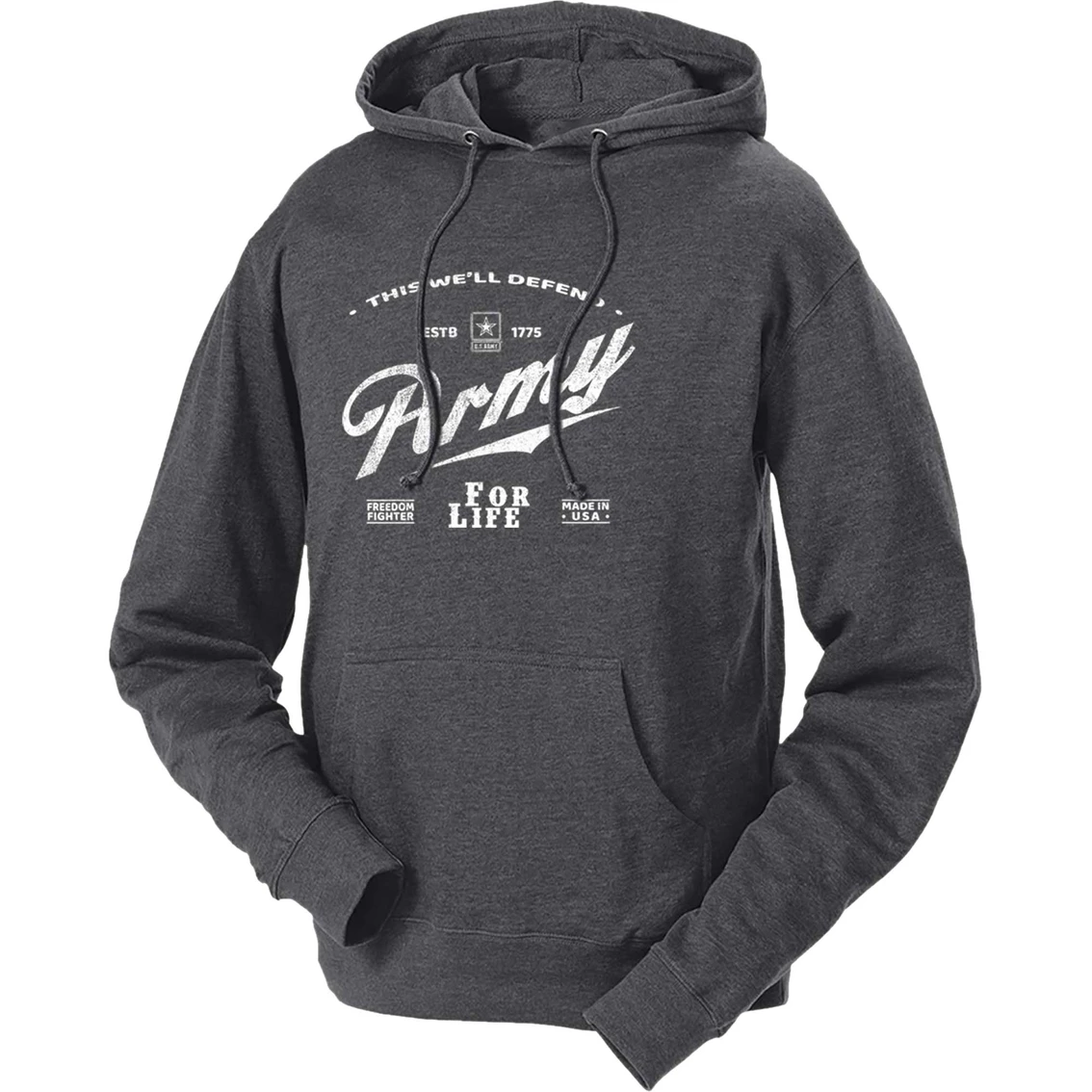 Stay warm and look great dressed in the Army Logo Core Hood Sweatshirt. It’s made of 50% Cotton/ 50% Polyester for comfort and easy care. The screen print says, “Army For Life.” Hoodie has kangaroo pocket and ribbed cuffs. Style: 762-H1740CHAR.
