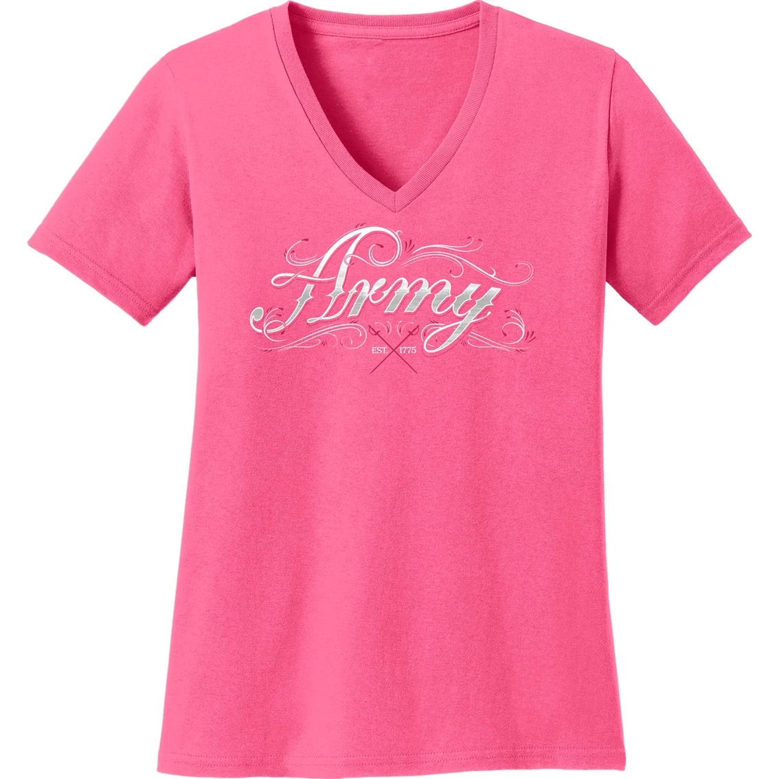 Army proud. A comfortable, classic women’s tee from 7.26 Design. Give your everyday t-shirt collection an update with this short sleeve Army ladies V-neck tee. Screen print design on front. Pair with your favorite shorts or jeans for a casual cool American look. Style: 762-1743.