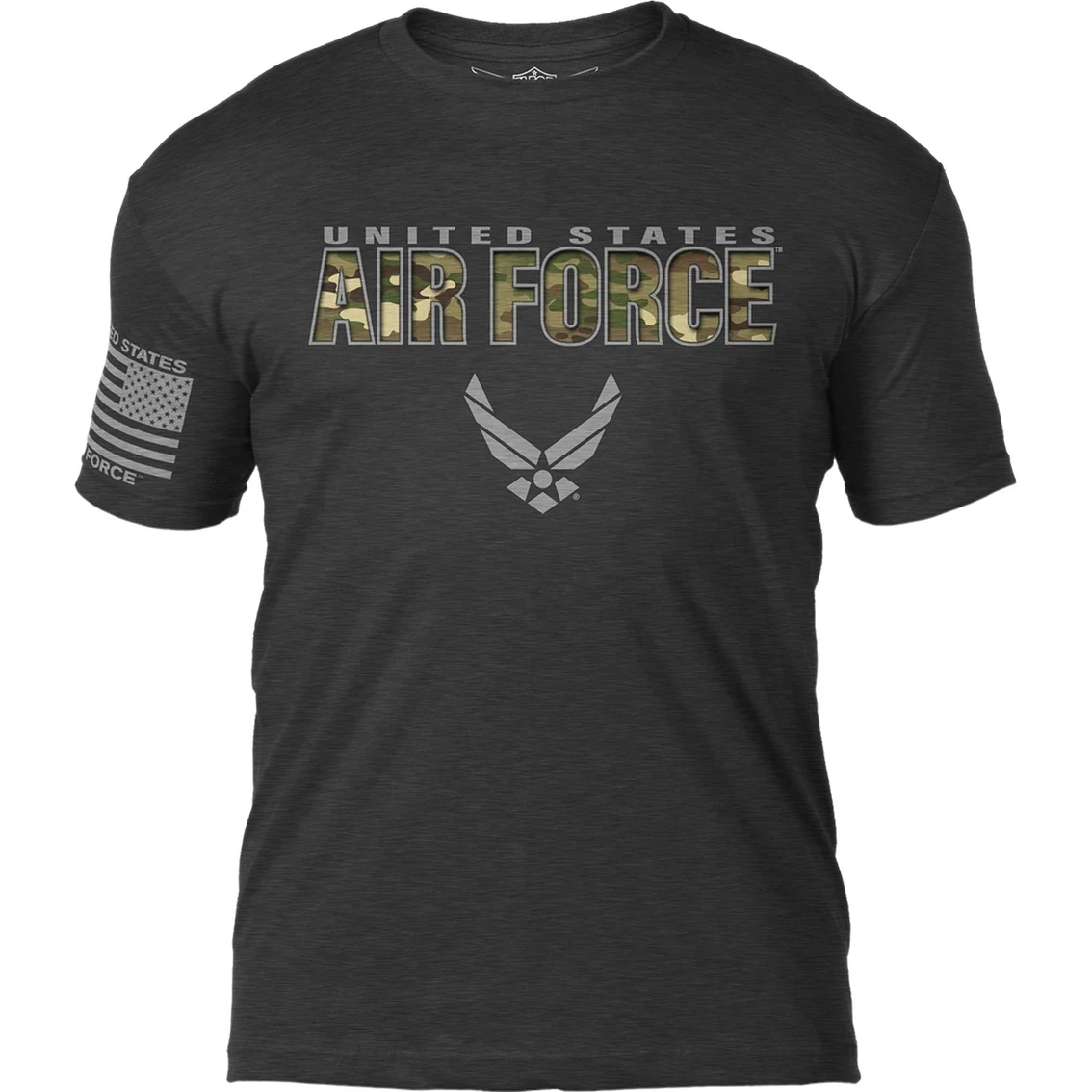 Crafted from mid weight, 60% cotton and 40% polyester, this athletic fit tagless tee from 7.62 Design features a screen printed graphic on the front and the right sleeve. This 7.62 Design US Air Force Camo Text Tee is proudly designed and printed in USA, and features unrivaled, all-original, copyrighted artwork. Style: BAT1101.