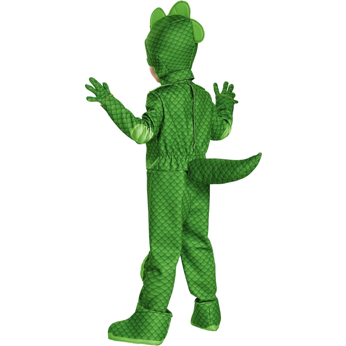 Your child can pretend to be a superhero with this cool PJ Masks Deluxe Gekko costume! The deluxe child costume includes a green jumpsuit with attached foot covers and detachable tail, green gloves and a soft headpiece. The headpiece and jumpsuit have glow-in-the-dark details making this the coolest super-pajamas ever! Care instructions: Hand wash cold, do not bleach. Dry flat, do not iron. Style: DG17166.