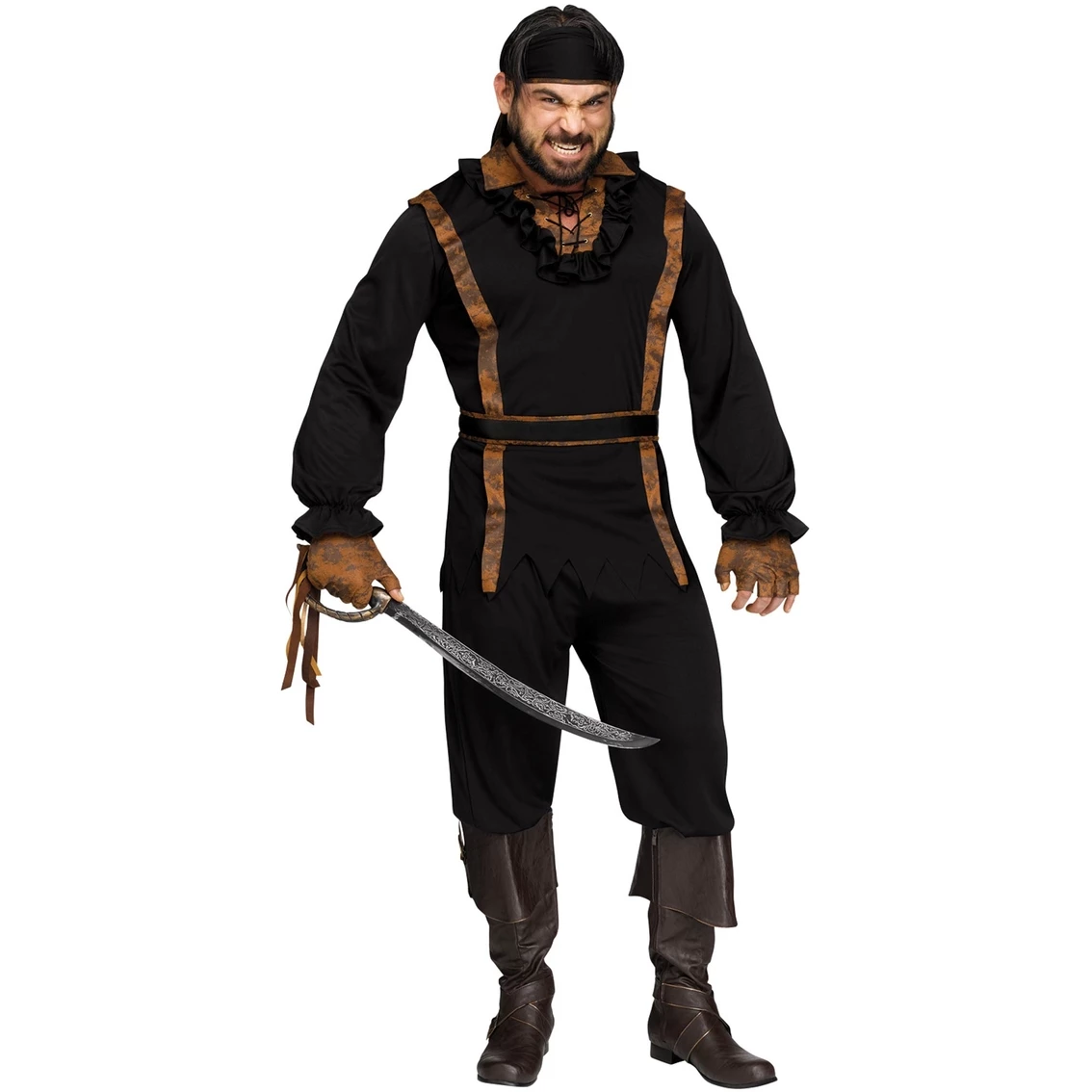 This Dark Pirate from Fun World is ready to make someone walk the plank! Costume includes a lace-up shirt with brown accents, matching belt, fingerless gloves and bandana. Add your own boots, pants and pirate sword for a swashbuckling night!