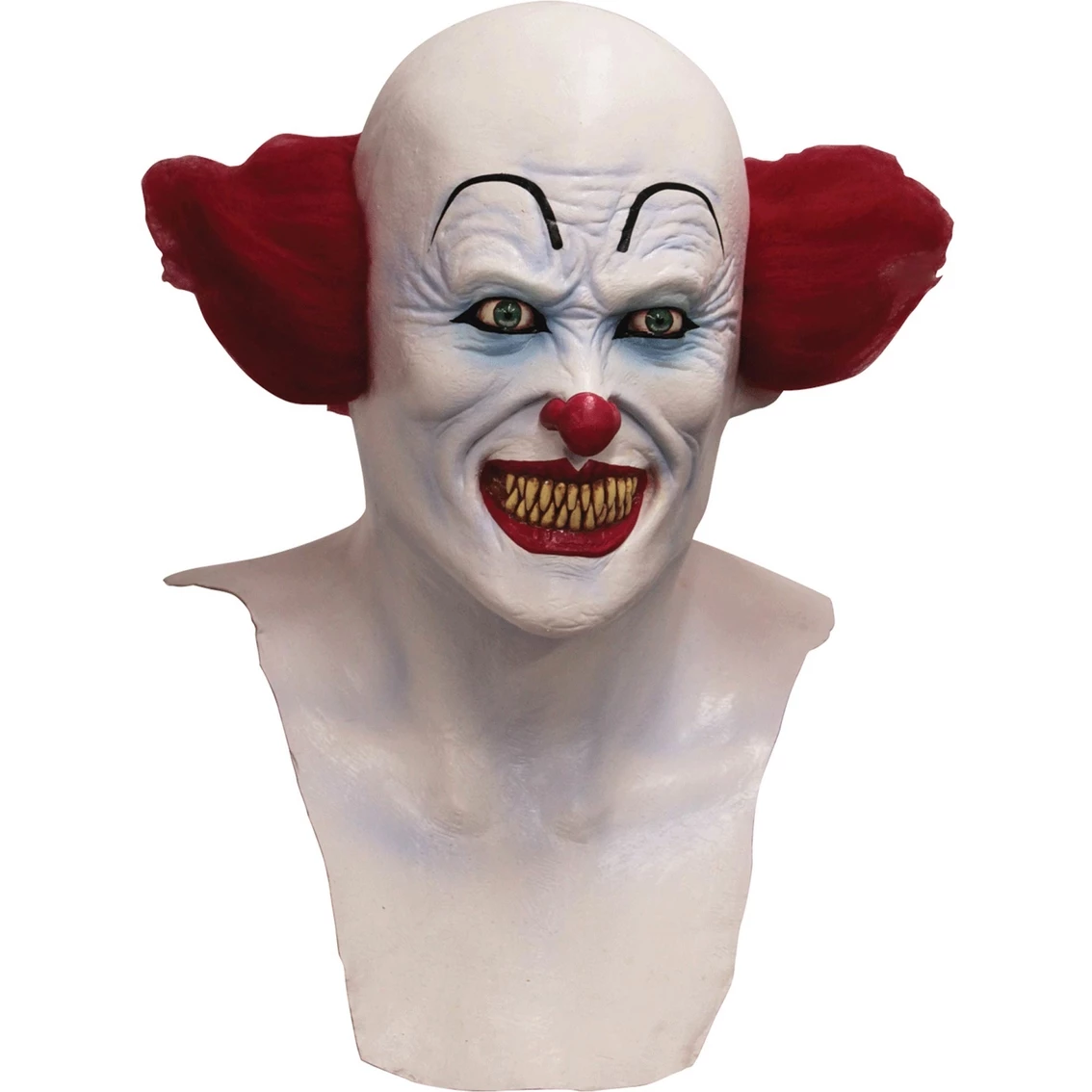Some of us never really shake the fear of clowns. Bring nightmares to life with this Scary Clown Mask from Ghoulish. Full over-the-head mask with chest piece features a scary clown with red tuffs of hair on the sides of his baldhead. His skin is painted clown white with an eerie blue glow and his face is detailed with black arched eyebrows, a traditional red clown nose and a creepy grin with yellow pointed teeth. One size fits most. Model: TB26580.