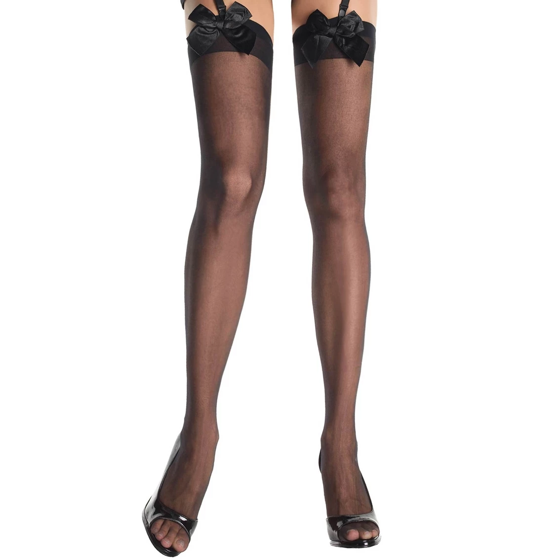 Nylon sheer thigh highs with satin bows. One size fits most. Style: UA1911.