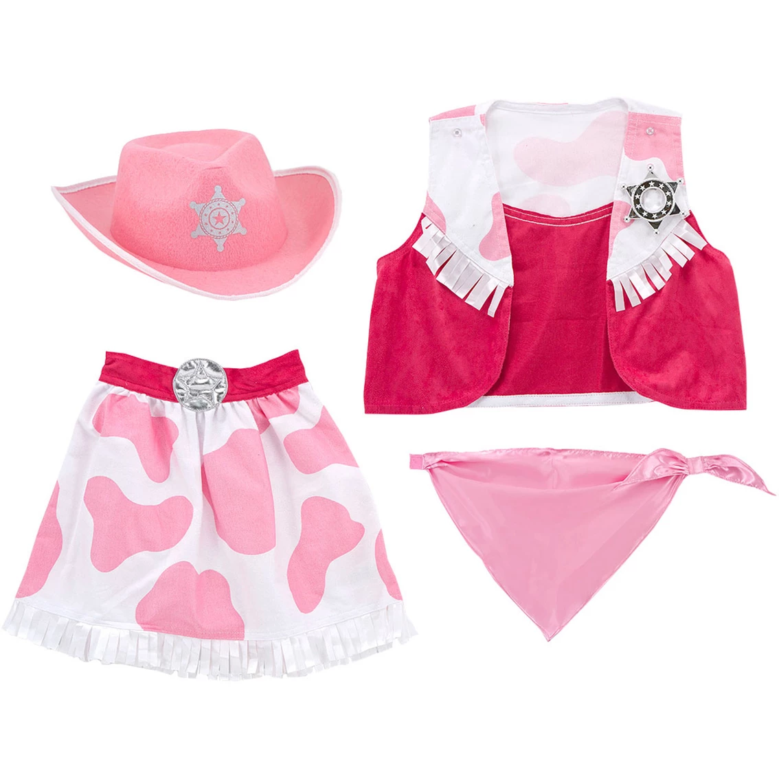 Cowgirl dress-up? Yeehaw! With this costume’s pink-and-white cow-print skirt, pink satin neck scarf, pink hat and a removable sheriff’s badge, your young cowgirl is in for some wild-west adventures! This exciting role-play set, sized for children ages 3 to 6, will inspire limitless imagination and pretend-play fun. Model: 4272.