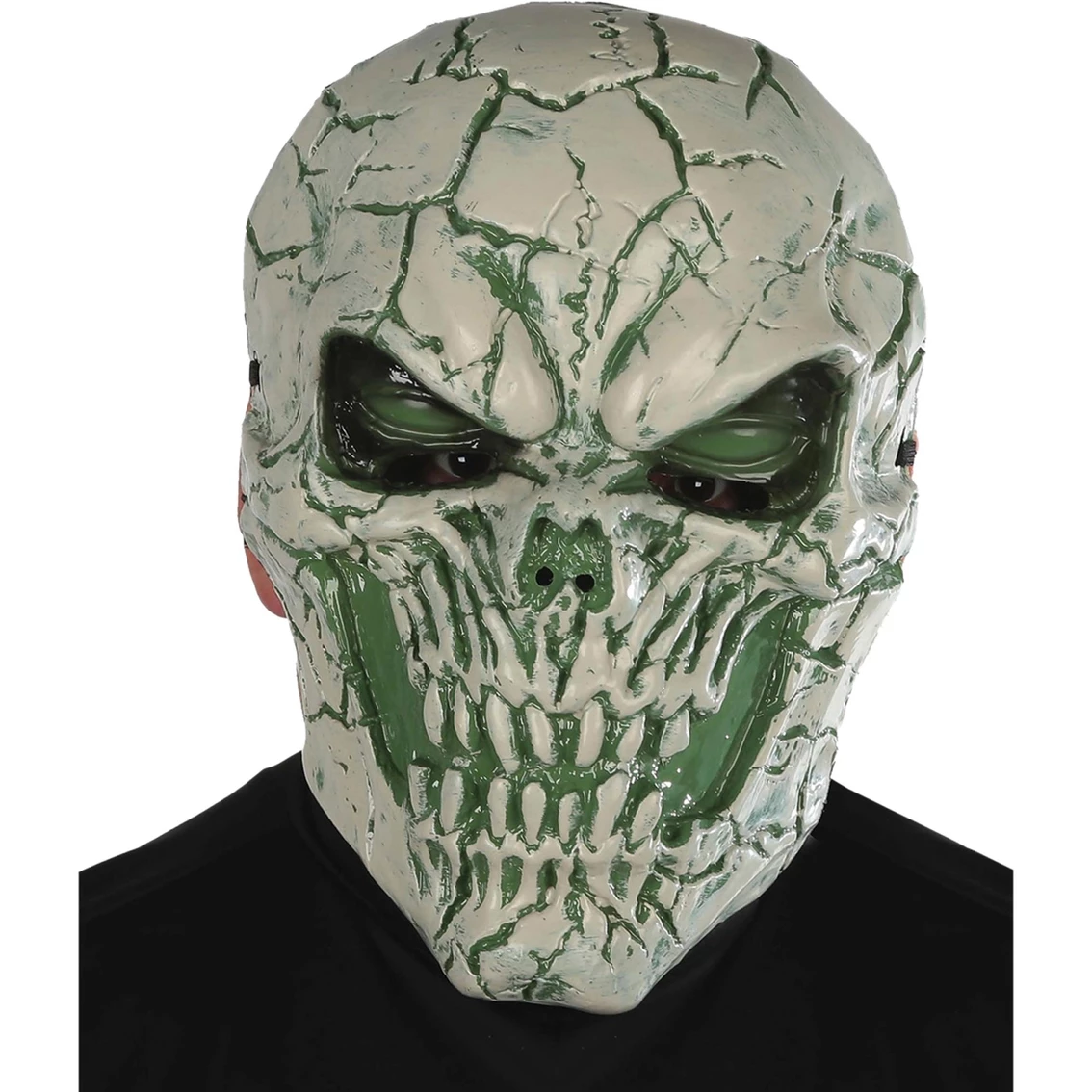 This light-up face mask from Morris Costumes depicts a rotted cracked skull that glows a disgusting green when activated. Mask includes elastic strap and foam square at the forehead. Requires 2 AAA batteries (sold separately). One size fits most. Style: MR131472.