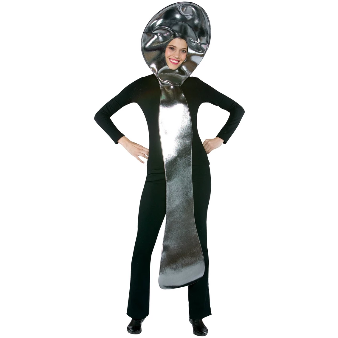 In the mood for spooning? Or is it too spoon? Throw on this adult spoon costume from Rasta Imposta and you can spoon feed puns all night long! Costume includes poly-foam over-the-head tunic that looks like a giant silver metallic spoon with an opening for the face. Tell Mr. Fork and Mr. Knife that you will see them spoon! Cute group costume idea for some punny people. Care instructions: Do not wash, bleach, dry clean, or iron. Spot clean only. One size fits most up to 6 ft. 3 in. tall, 48 to 53 in. chest size. Style: GC6124.
