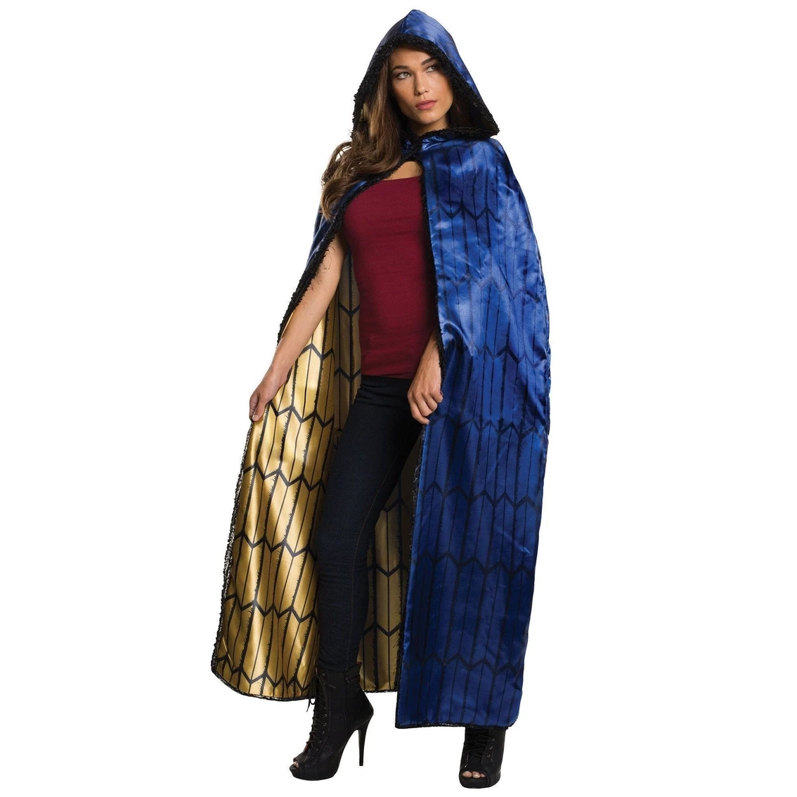 Wrap yourself up in this Batman V Superman: Deluxe Adult Wonder Woman Cape Costume to complete your Amazonian warrior costume. This hooded cape comes in a printed royal blue while the inside features a printed golden color. There printed design is a feather-like patterne along the surface. Complete any Wonder Woman costume by including this cape in your order.