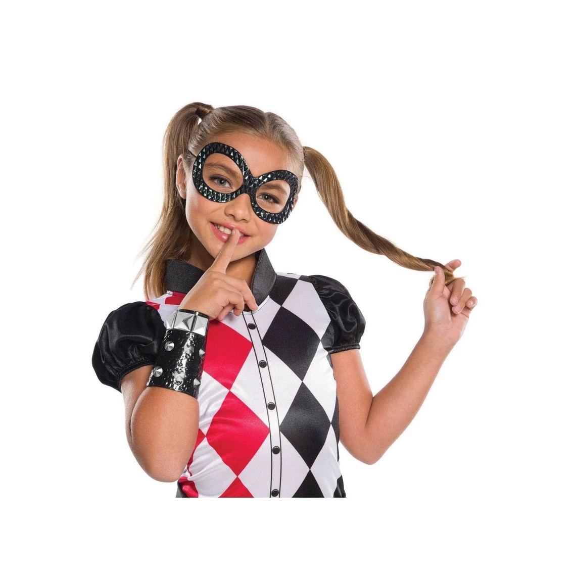 Your child can now give the infamous Harley Quinn a new look that is different from the classic outfit but still has the spunky Harley style. The DC Super Hero Girl’s Harley Quinn Accessory Kit comes with bedazzled black mask and stylish riveted gauntlet to give the perfect finishing touch to her DC Super Hero Girl outfit. This set will make your little clown stand out from the crowd at Super Hero High.