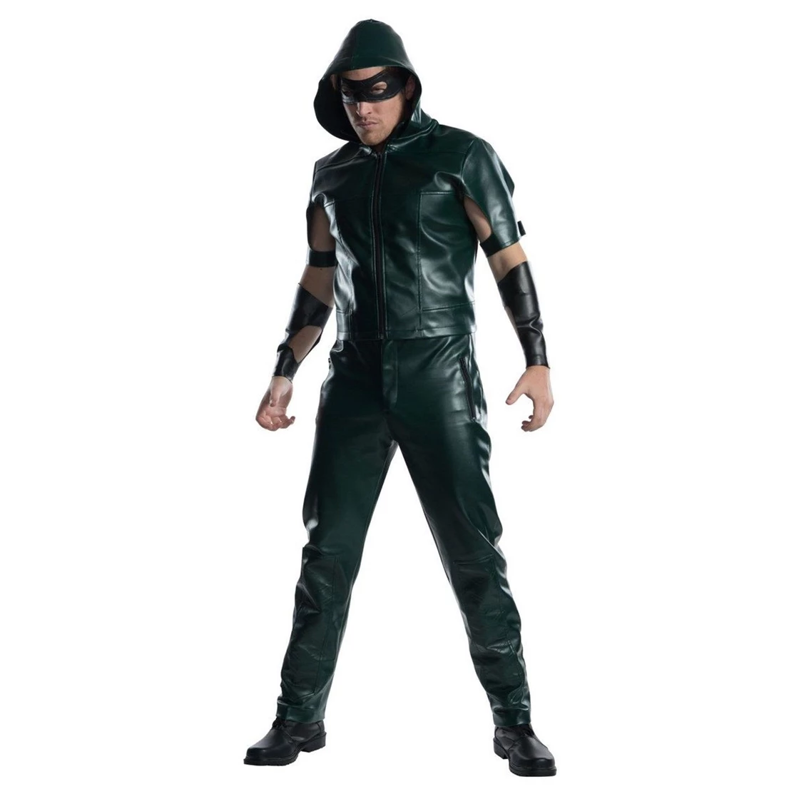 Step into the shoes of your favorite superhero this Halloween in our DC Comic Deluxe Green Arrow Adult Costume! This superhero outfit comes with a hooded pleather short sleeved jacket and matching pants to get you in character as Green Arrow! Also included is a eye mask and arm guards for a truly authentic feel. Add your own bow and arrow to complete you Arrow costume and you’ll be ready for any villain that may cross your path.