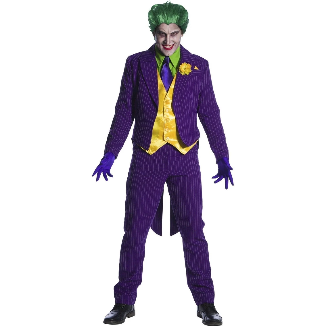 Transform into Batman’s most chilling advisary in Gotham City. This officially licensed Joker Classic Deluxe Adult Costume looks like it was taken straight from the comic strips of classic Batman. This deluxe costume is a three piece suit with yellow vest, green shirt and purple tie, all under a pin striped suit jacket with tails and matching pants. It’s the small details that set this costume apart with a yellow handkerchief to tuck into your jacket pocket and a yellow flower pinned to the collar. Slip into these threads and get ready to wreck havoc on every city from Gotham to Gainesville. If you have a kink for watching your noble adversaries squirm over moral conundrums then this is the perfect costume for you.